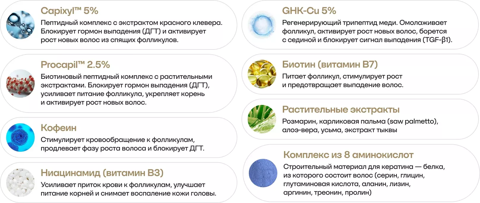 Ингредиенты в сыворотке, которые укрепляют луковицу: Capixyl 5%, GHK-Cu (пептид меди), Procapil 2,5%.